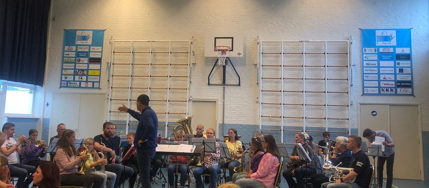 5 juli 2024Afgelopen vrijdagavond hebben wij ons laatste concert van het seizoen gegeven. Een zomerconcert. Wegens het slechte weer, speelden we binnen, maar dat mocht de pret niet drukken. Samen met de basisschoolleerlingen hebben we er een fantastisch optreden van gemaakt. EZG begon met een repetair aan muziek. Daarna was het tijd om naar het circus te gaan. Figuurlijk dan 😜. De AMV’ers wisten er één grote show van te maken. Ze hebben gedanst, gezongen en zelfs nog hun acrobatische skills laten zien, door middel van handstanden, radslagen en bruggetjes te maken. Om de show nog groter te maken, kregen de kinderen van onze dirigent Jan Hibma zelfs nog de kans om ons te dirigeren. Als Jan ons ooit gaat verlaten en we in de toekomst nog opzoek moeten naar een nieuwe dirigent, hoeven we niet ver te zoeken 😊. De jeugd van Hommerts-Jutrijp zijn als geschikte kandidaten uitgekozen. Daarna was het de tijd aan Jens Nauta op de bugel , Emmeke Wouters op de bugel en Marin Grondsma op de trompet. Er is fantastisch nieuws, want zij hebben dit jaar hun A diploma gehaald en zullen volgend jaar bij ons orkest aansluiten. Zo wordt ons orkest langzaam een klein beetje groter. Daarna was het weer tijd voor EZG om van zich te laten horen en als kers op de taart werden de laatste 2 nummers, Multicolor en Europapa gespeeld door alle muzikanten die deze avond aanwezig waren. Fanfare EZG, Jens, Emmeke, Marin en de kinderen van de AMV maakten van deze avond een spetterend einde. Het was een gezellige avond vol vrolijke gezichten. We hebben een mooi seizoen gehad en hopen jullie volgend seizoen weer vaak in ons publiek te mogen verwelkomen. 🎶