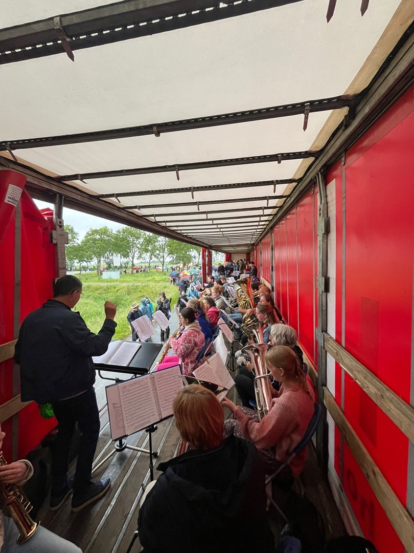 Efen foar healve njoggenen—krekt tusken de oanhâldende buien troch—manoefreerden wy te Frentsjer alle blaas- en slagwurk-instruminten in grutte trailer yn. It wie in lyts bytsje krap, mar dat we in lyts offer foar in dak boven de holle. Yn tsjinstelling tot de wandelaars koeden wy it sadwaande tiidens it oere dat wy spielden gruttendiels drûch en waarm hâlde.